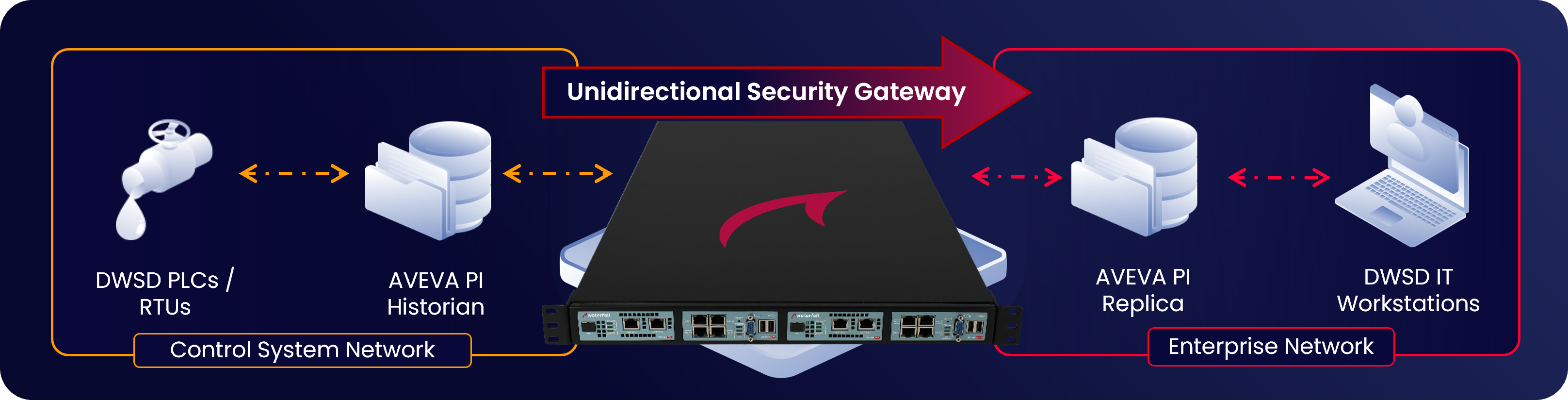 Detroit Water replaced the IT/OT firewall with a Unidirectional Security Gateway. The gateways replicate an OSIsoft PI historian from the OT network to the IT network. The IT PI replica provides enterprise users and applications with real-time access to all operations data authorized to be shared with the enterprise. The enterprise hydraulic analysis application draws real-time reservoir levels, pressures and pump indications from the replica historian. A secure web portal accesses equipment status information, billing information and other readings from the replica as well. This data IS available to utility management, end users and field personnel.